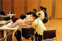 特に参加者がお互いの手や足に施術をしあう実技の時間では、会場のあちらこちらから「あー気持いいわ」「眠くなってきちゃった」等の声があがり、